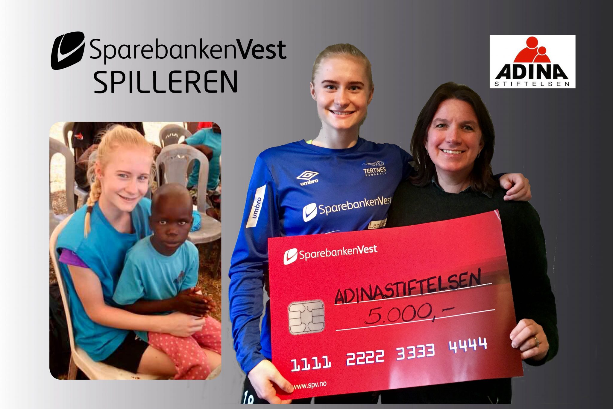 – Adina Stiftelsen vil takke Rikke Larsen Øyerhamn hjerteligst for at hun valgte oss som mottaker av premien hun ble tildelt som Sparebanken Vest-spilleren. Barn og unge er viktige bidragsytere til Adina Stiftelsen, og Rikke er en av flere ungdommer som har vært med oss på prosjektbesøk til Uganda hvor vi driver et rehabiliteringssenter for funksjonshemmede barn. Hun engasjerte seg der i barna gjennom lek, konkurranser og ved å hjelpe dem med sine daglige gjøremål.