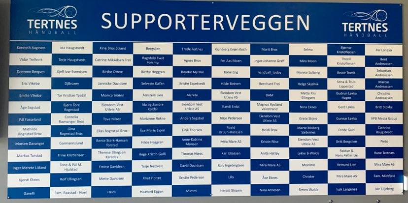 Den dekorative SUPPORTERVEGGEN er å se i vrimleområdet i 2. etasje i Åsane Arena, og ifm. ny sesong skal veggen fornyes. Vi håper selvsagt alle som var med sist, ønsker å være med på nytt, i tillegg gir vi muligheten til at enda flere kan få vise sin støtte Tertnesjentene!